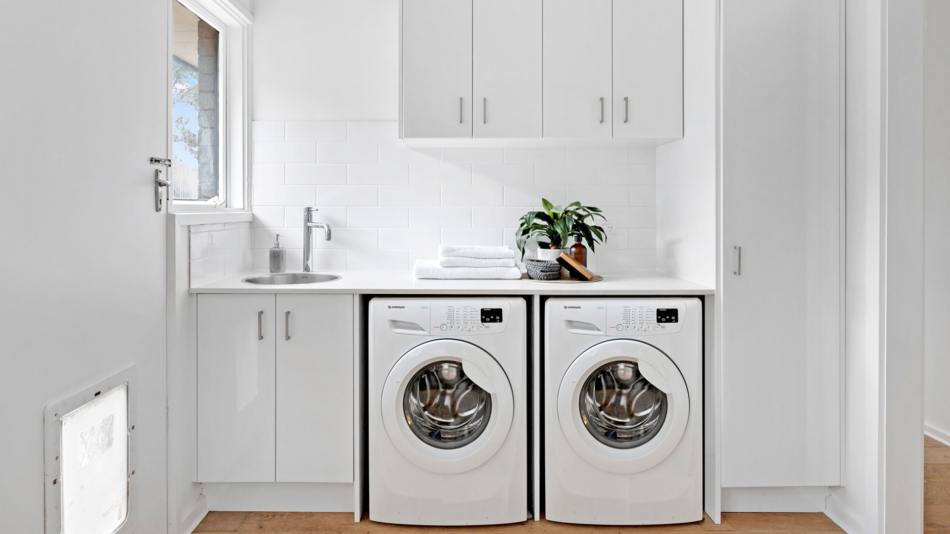 Install overhead cabinets above your washing machine to free up valuable benchspace and keep your laundry products organised and out of sight.